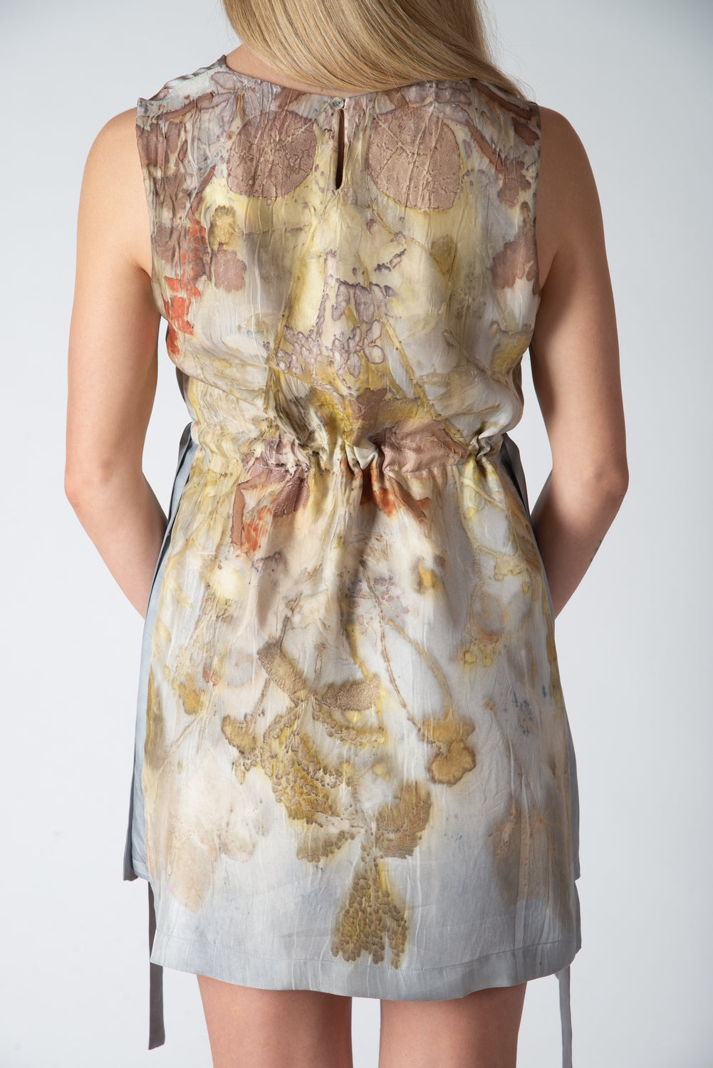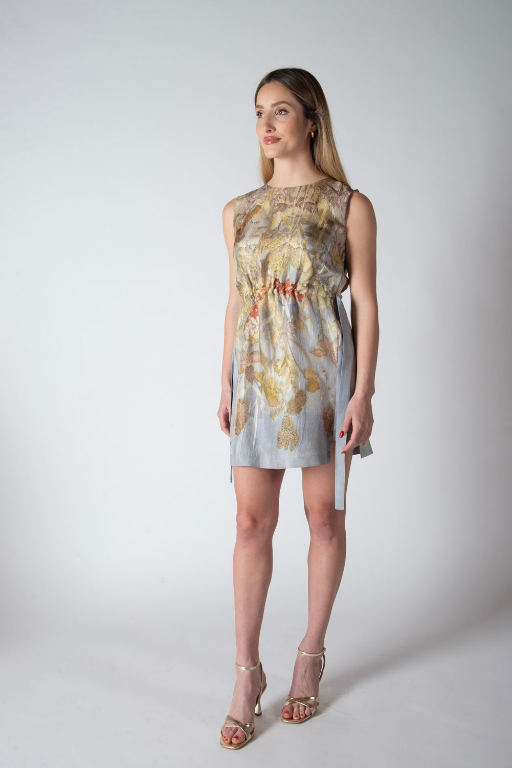 Abito corto dritto in twill di seta eco stampato, con coulisse regolabile in vita.