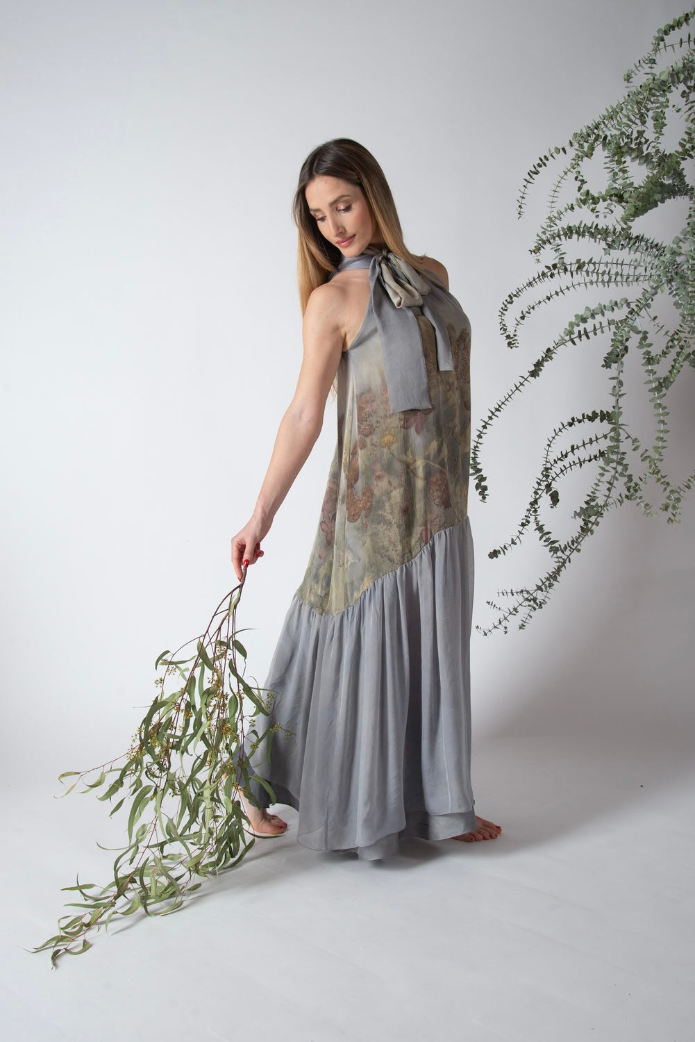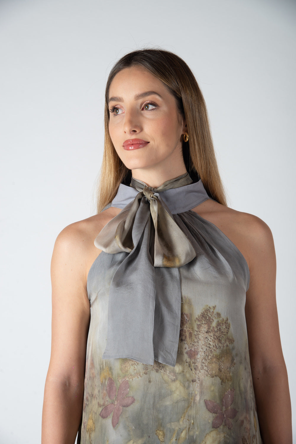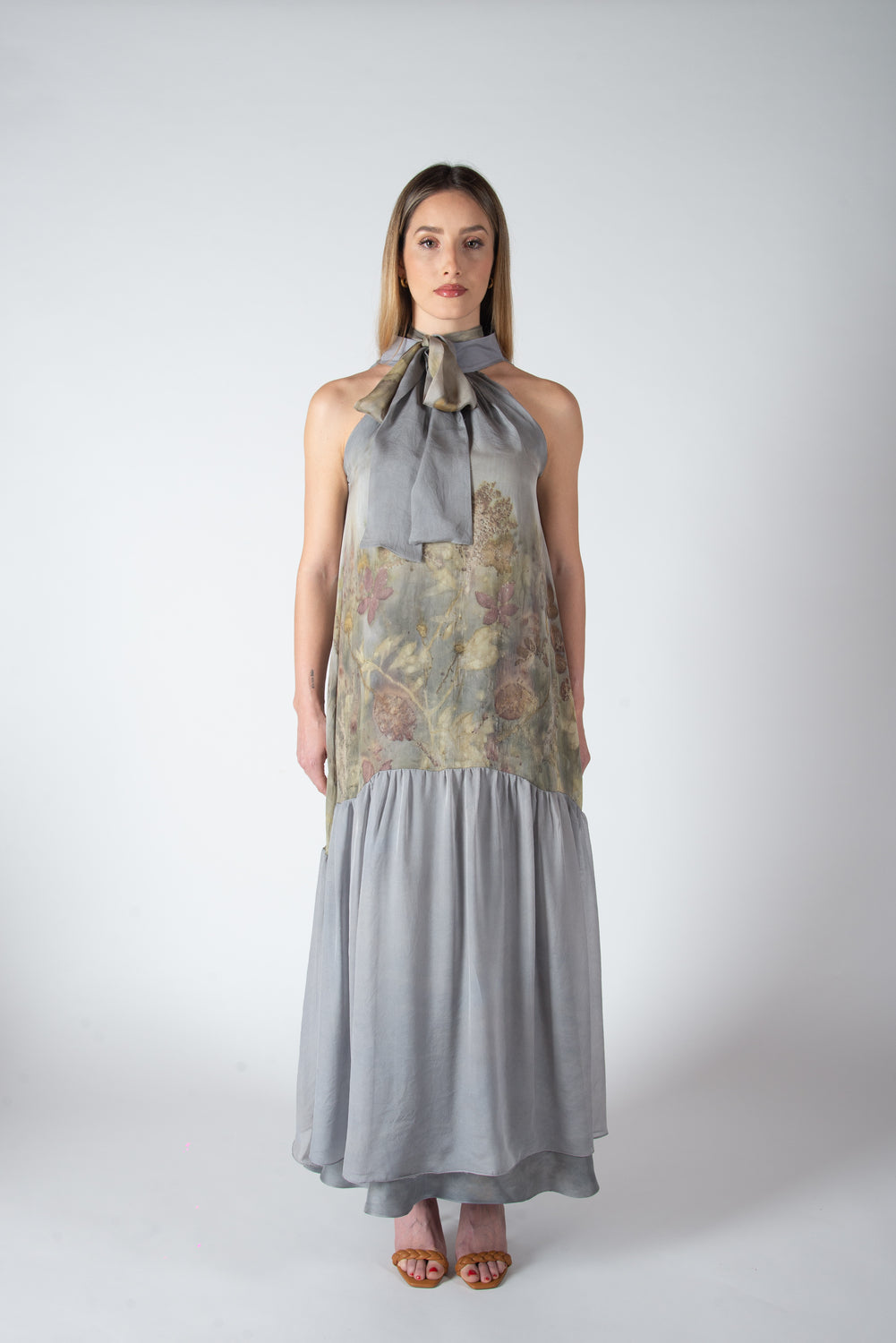 Abito svasato in doppio strato: base in twill di seta tinta naturalmente e strato esterno in chiffon di seta eco stampato con balza finale. Chiusura con lacci, da legare dietro o intorno al collo con fiocco sul davanti.