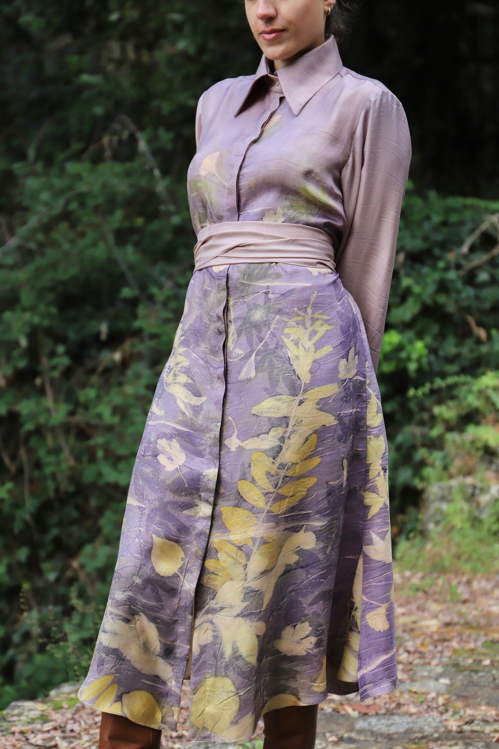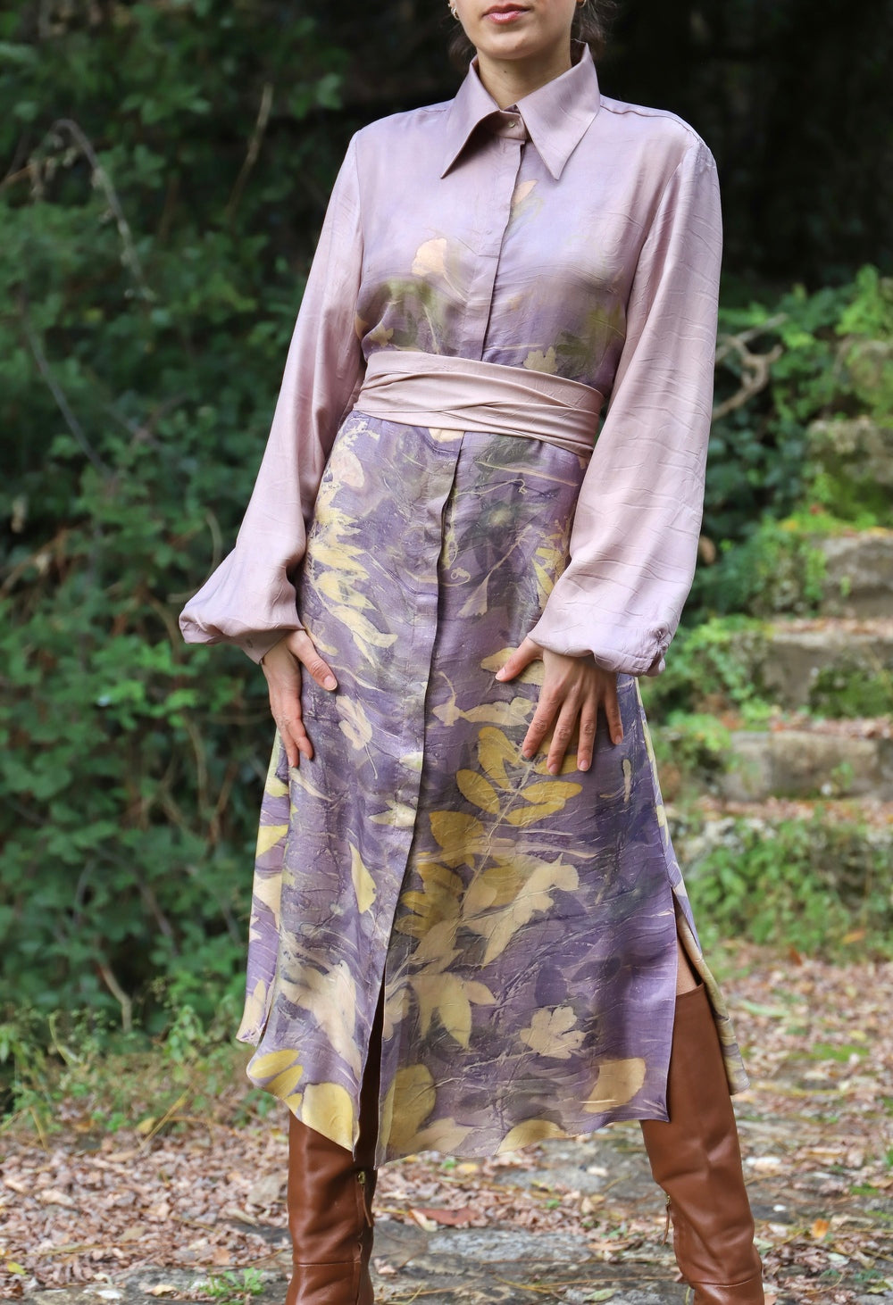 Abito camicia in twill di seta, morbido e fluido, pensato per avvolgere il corpo con naturalezza ed eleganza. La sua linea scivolata è arricchita da una manica a palloncino che dona volume e femminilità, mentre l’abbottonatura nascosta con bottoni in madreperla conferisce un aspetto pulito e raffinato.