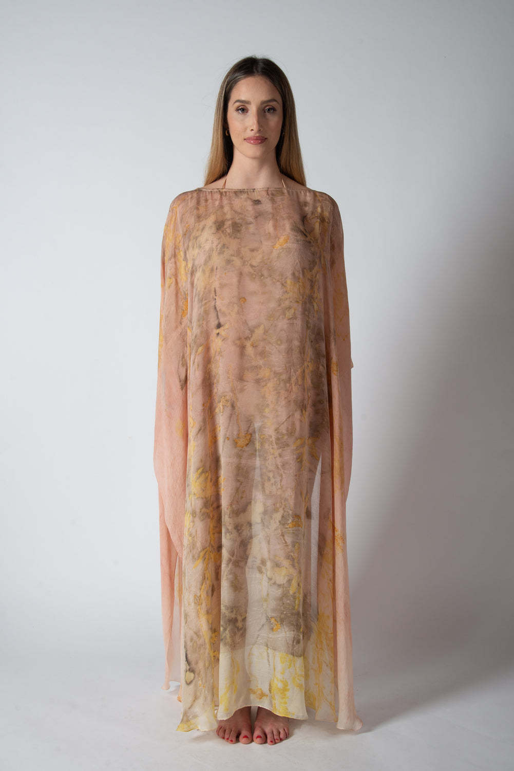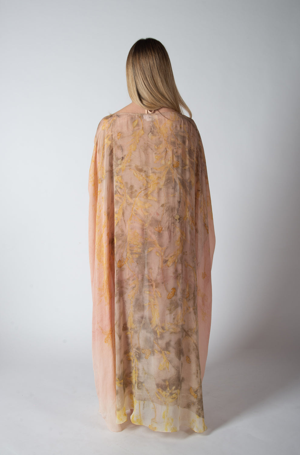 Caftano in chiffon di seta semitrasparente eco stampato, taglia unica.