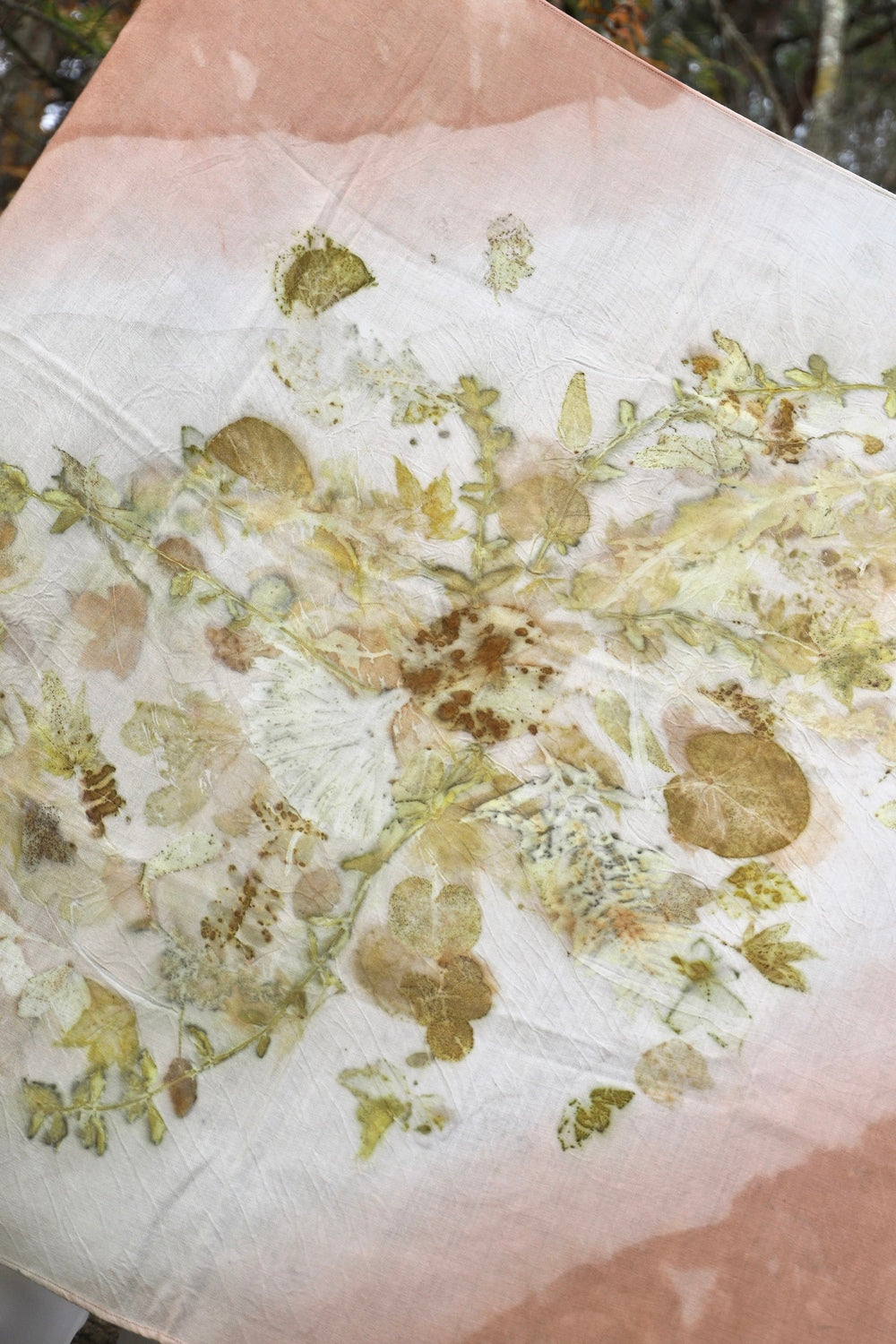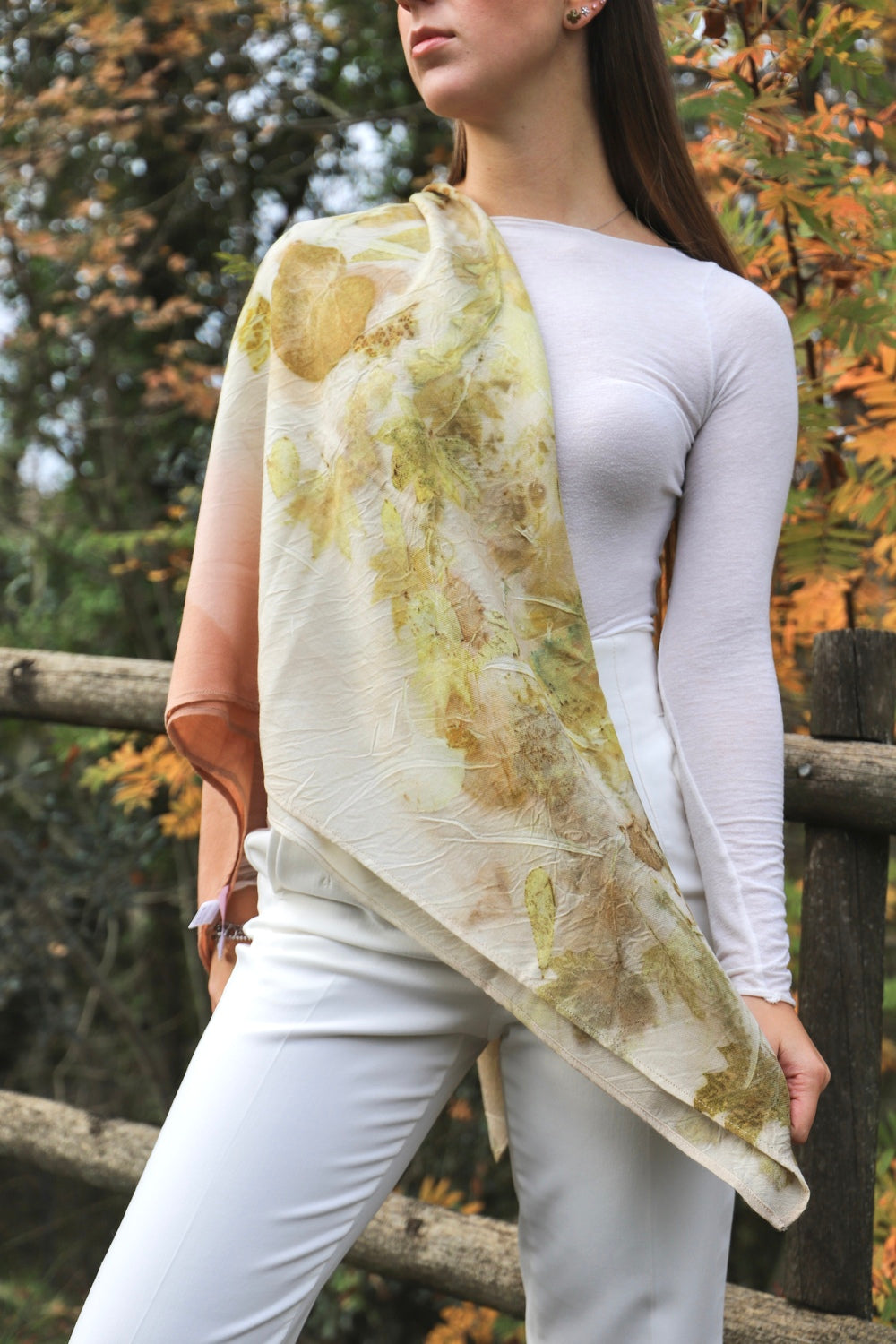 Le stampe sono realizzate artigianalmente utilizzando piante e foglie autunnali, le quali, attraverso un processo naturale, trasferiscono il loro colore e forma in modo permanente sul tessuto. Ciò che si crea è unico ed irripetibile, rendendo ogni capo una creazione esclusiva e sostenibile.