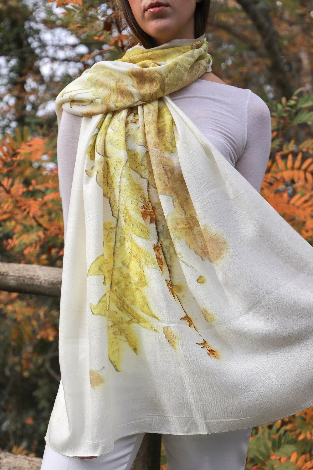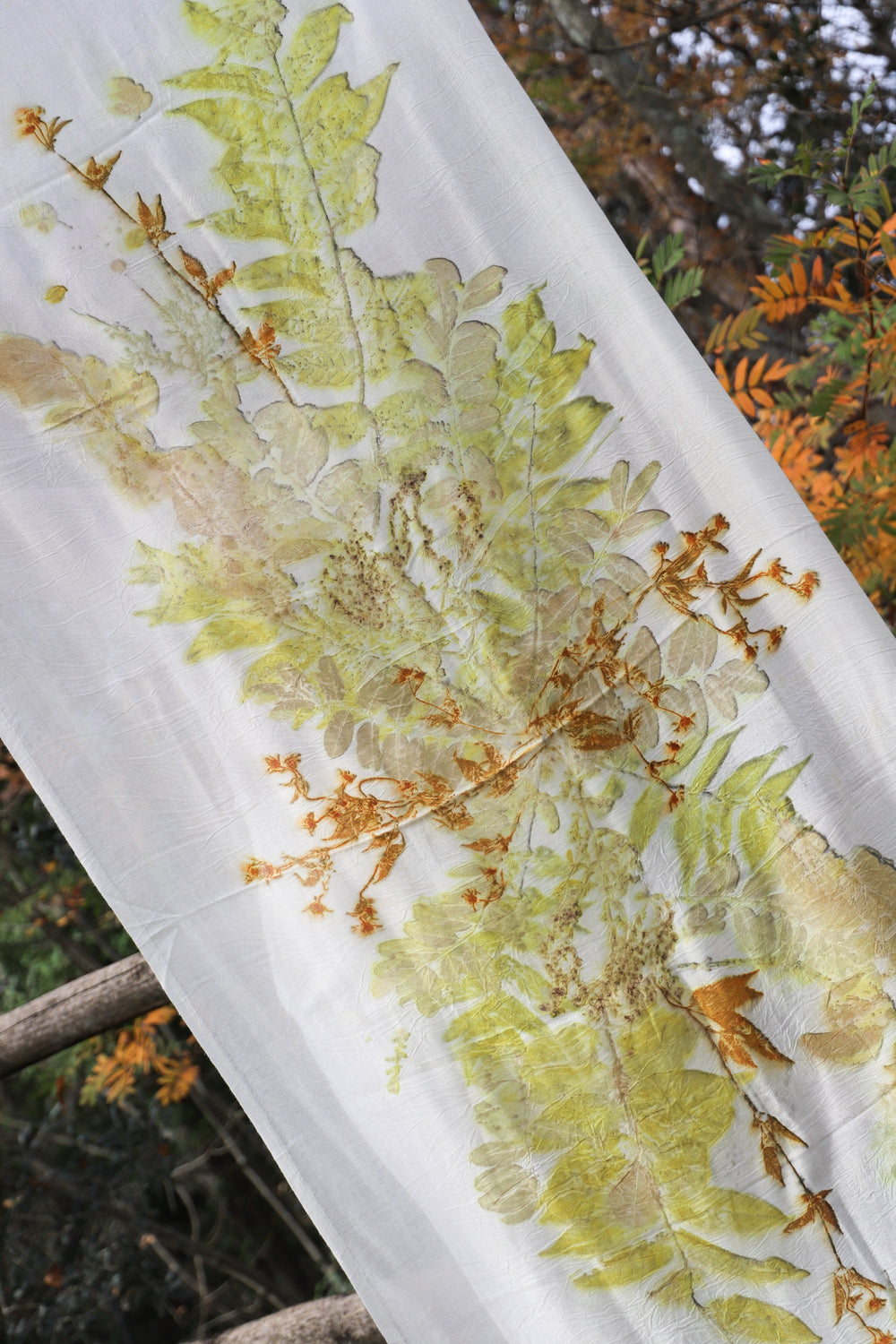 Le stampe sono realizzate artigianalmente utilizzando piante e foglie autunnali, le quali, attraverso un processo naturale, trasferiscono il loro colore e forma in modo permanente sul tessuto. Ciò che si crea è unico ed irripetibile, rendendo ogni capo una creazione esclusiva e sostenibile.
