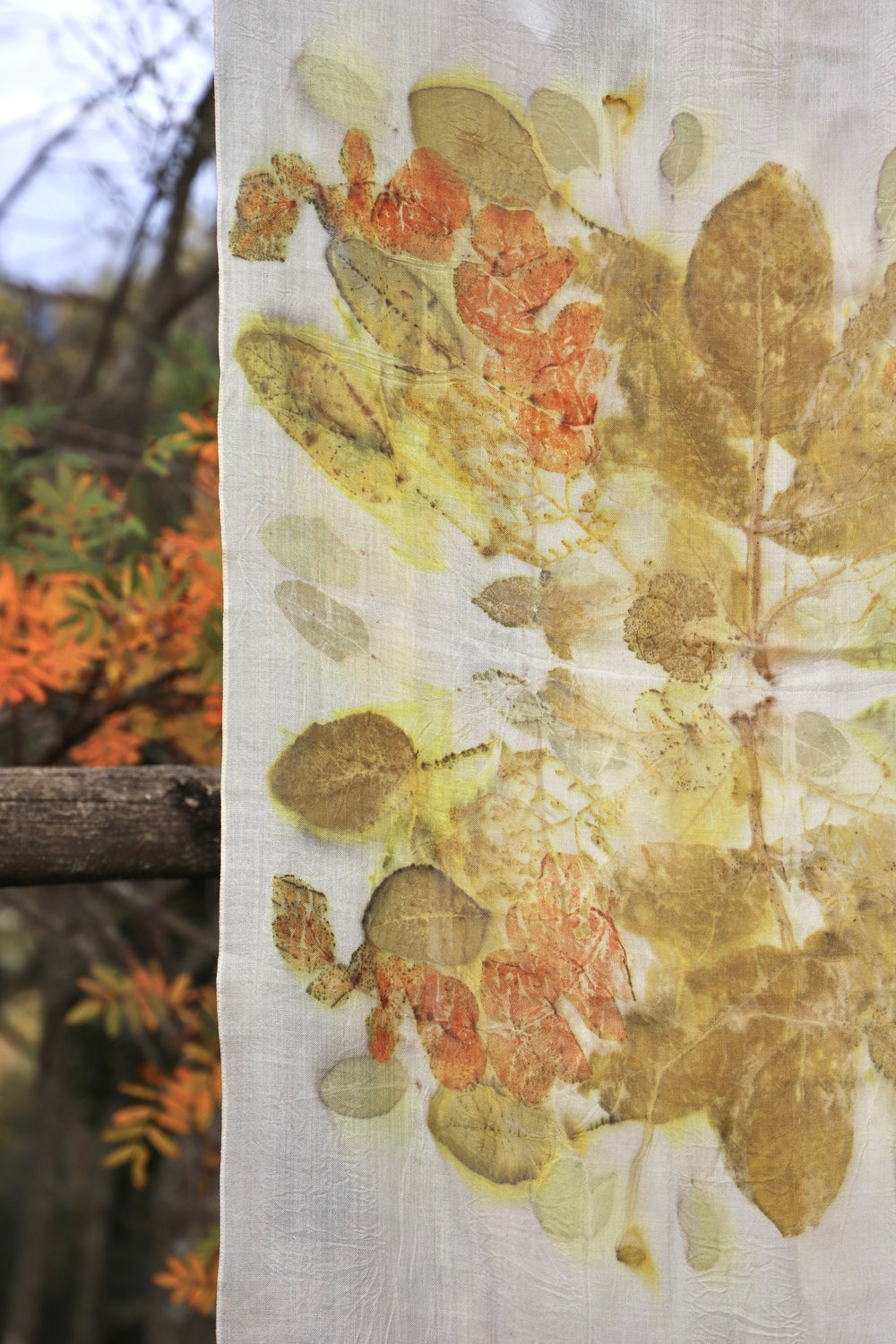 Le stampe sono realizzate artigianalmente utilizzando piante e foglie autunnali, le quali, attraverso un processo naturale, trasferiscono il loro colore e forma in modo permanente sul tessuto. Ciò che si crea è unico ed irripetibile, rendendo ogni capo una creazione esclusiva e sostenibile.