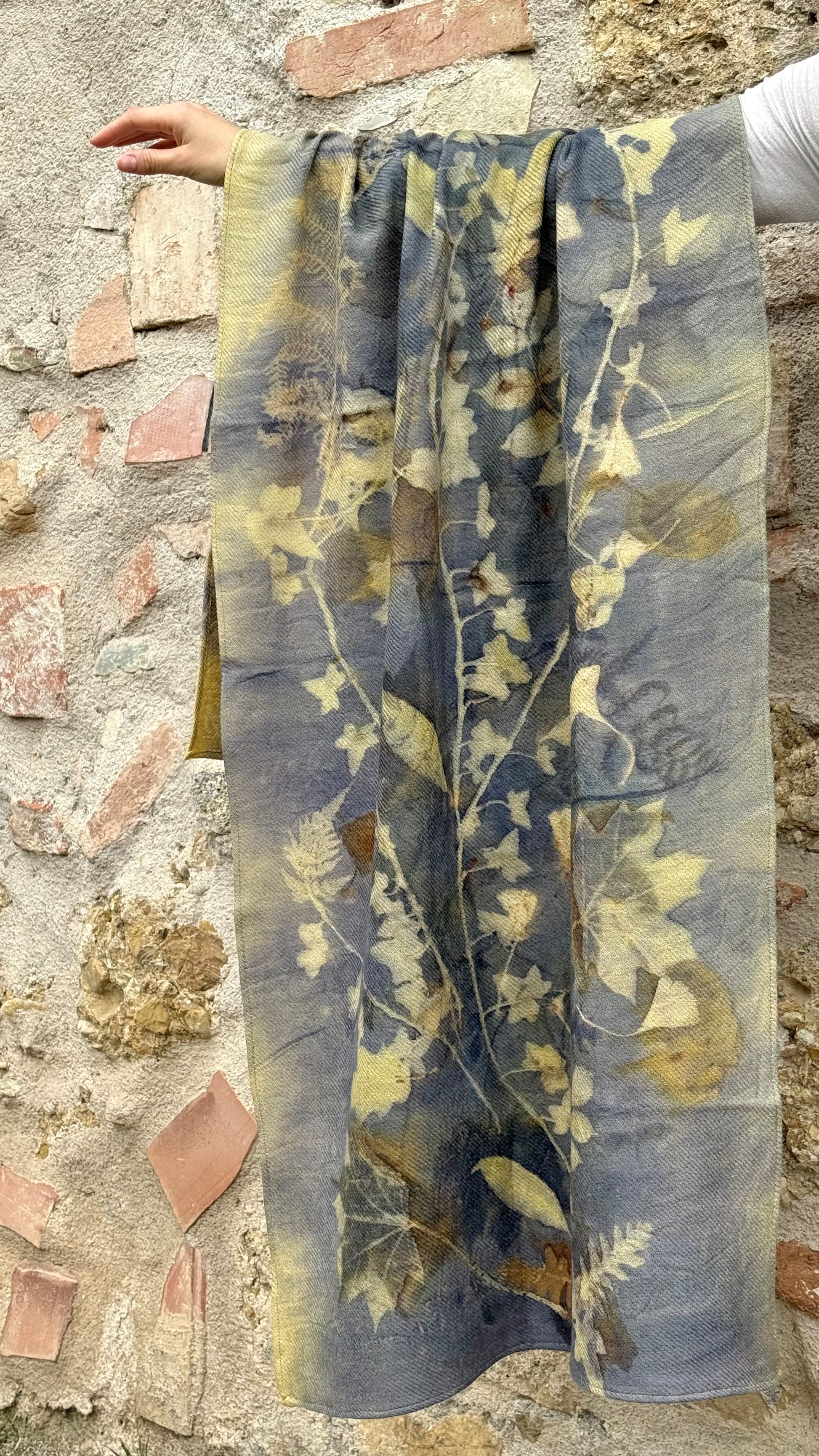 Le stampe sono realizzate artigianalmente utilizzando piante e foglie autunnali, le quali, attraverso un processo naturale, trasferiscono il loro colore e forma in modo permanente sul tessuto. Ciò che si crea è unico ed irripetibile, rendendo ogni capo una creazione esclusiva e sostenibile.