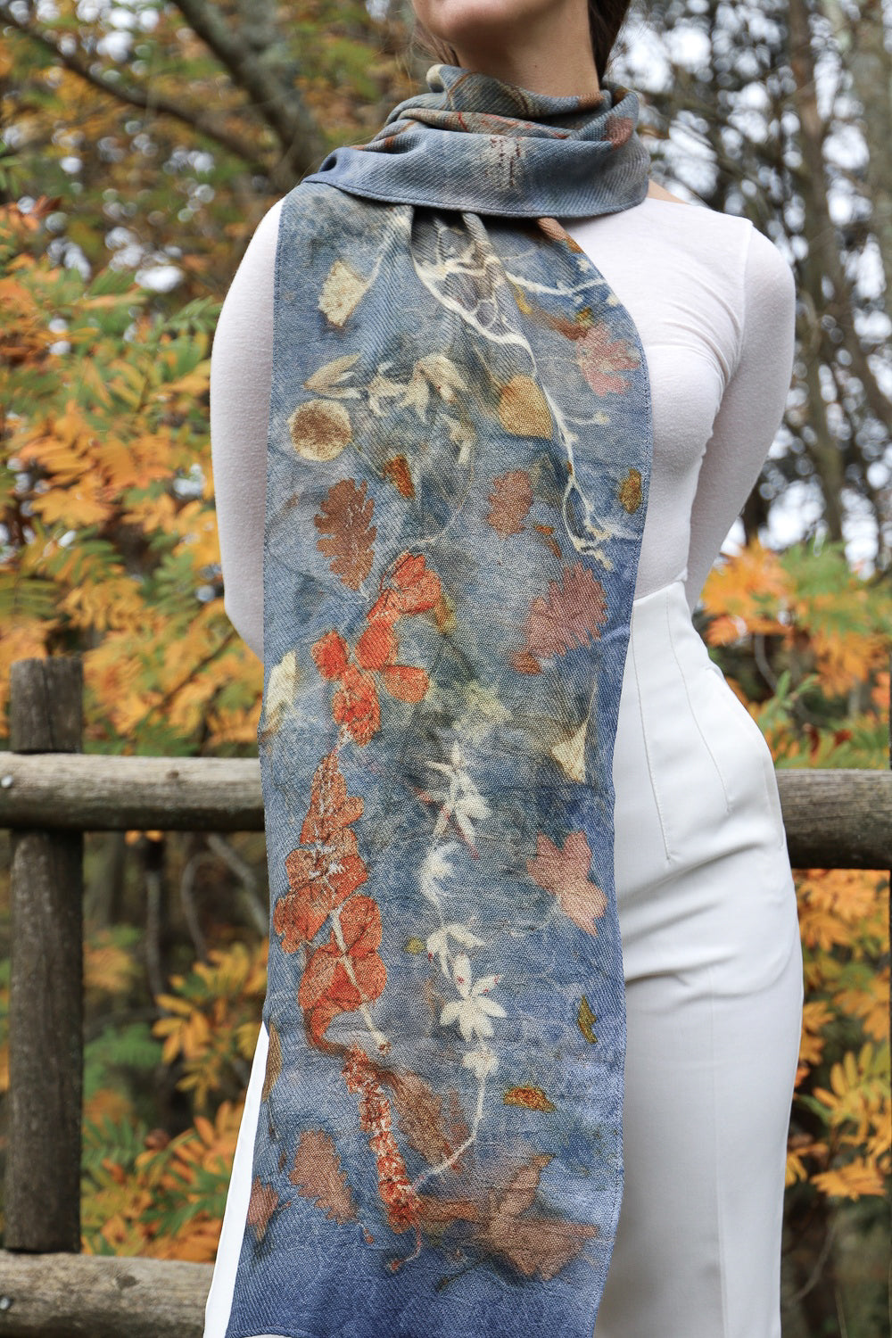 Le stampe sono realizzate artigianalmente utilizzando piante e foglie autunnali, le quali, attraverso un processo naturale, trasferiscono il loro colore e forma in modo permanente sul tessuto. Ciò che si crea è unico ed irripetibile, rendendo ogni capo una creazione esclusiva e sostenibile.