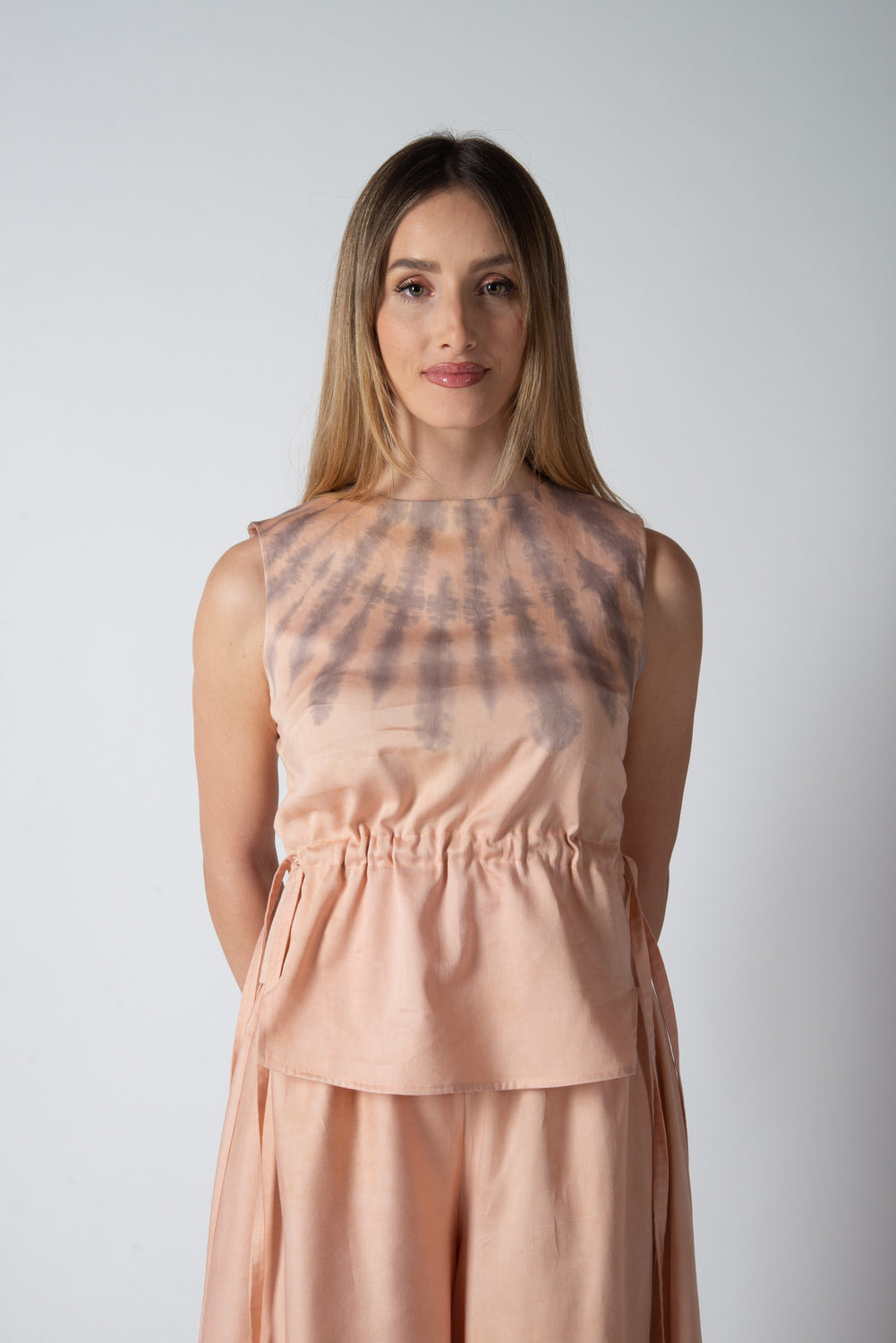 Top in raso di cotone eco stampato, taglio dritto, con coulisse regolabile in vita per definire la silhouette o lasciarlo morbido.